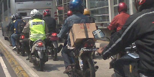 Polisi ini kalau mau membuat pelanggaran tidak sendirian, bersama pengendara lain dia menggunakan jalur bus way. Maklum, sebab menghindari kemacetan di Jakarta memang sangat sulit, alternatifnya gunakan jalur Bus way.