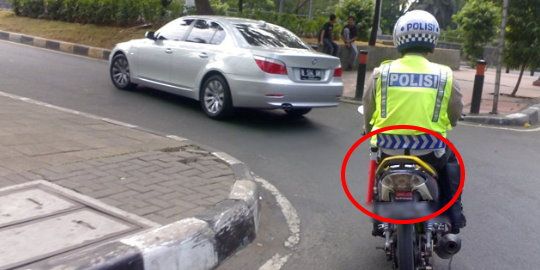Diperkirakan plat nomor kendaraan pak polisi ini jatuh. Bisa juga sengaja motor bapak ini tidak dikasih plat nomor, sudah aman tidak ada yang nilang. Sebab Bapak tersebut tukang tilang.